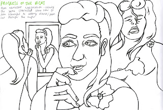 I would think, and it is, quite interesting to follow someone on a night out. Be a fly on the wall. This is what I am trying to communicate in this image. A girl getting ready, through to pre-drinks, through to sniffing coke, through to passing out at the end. It is shown as a crowd of the same person, in a snake-like composition, the smallest person being her at the beginning of the night, to the largest 'head' at the bottom being her at the end of the night. It is done with a thin fine liner for an experiment, unfortunately I don't think this works as a technique entirely well. I will try this with a thicker one :D